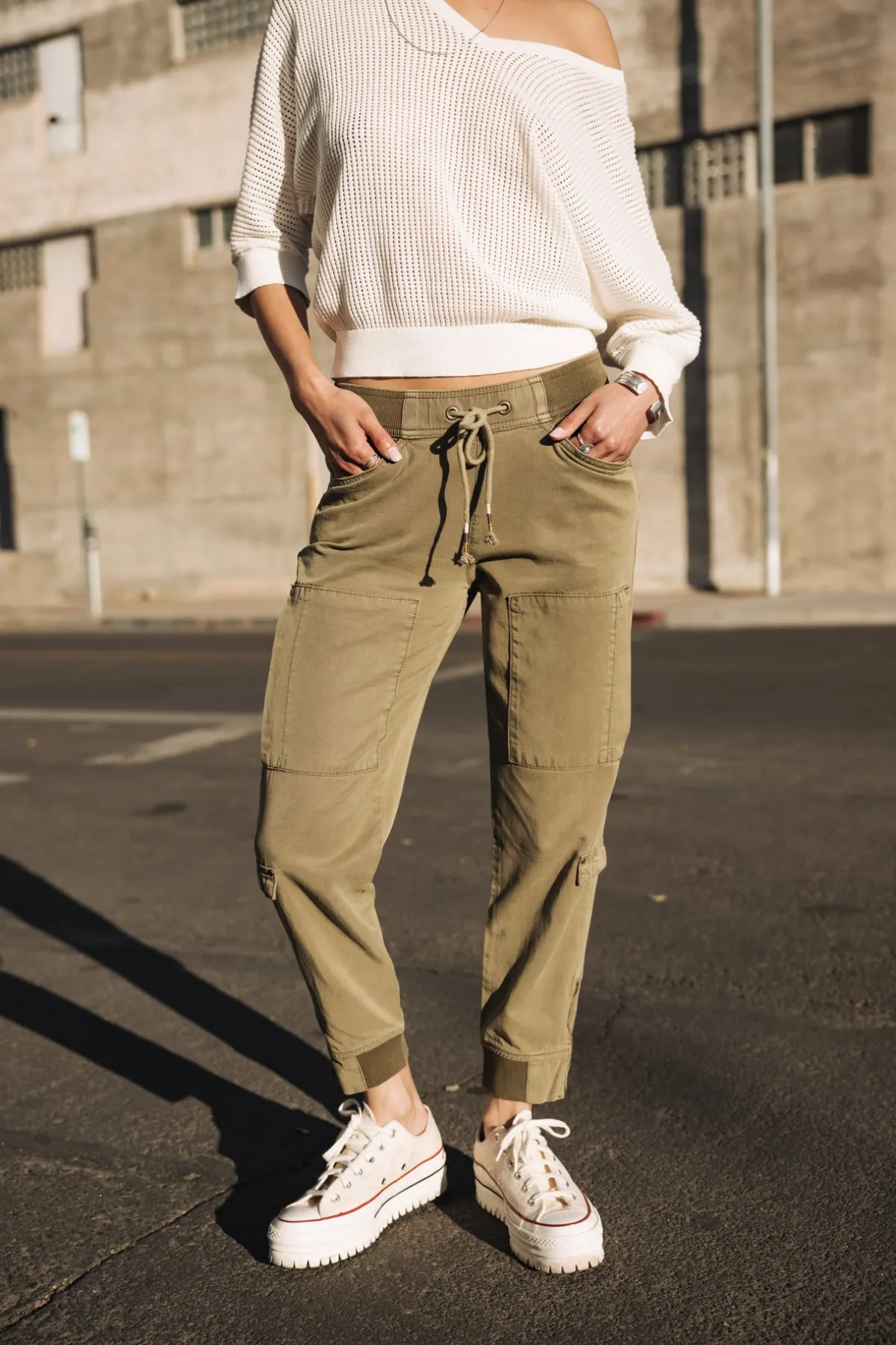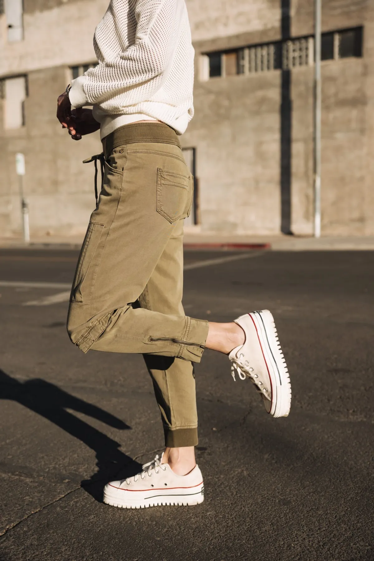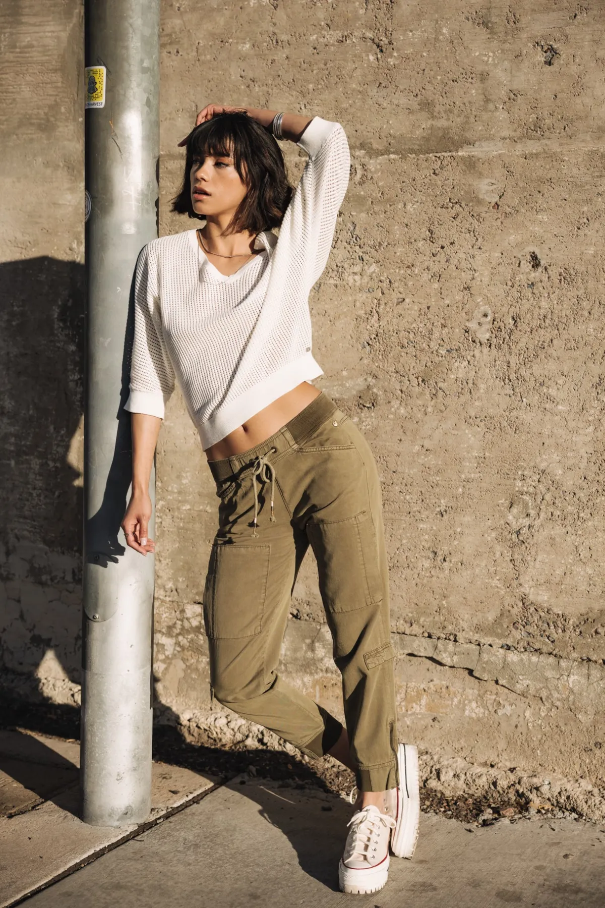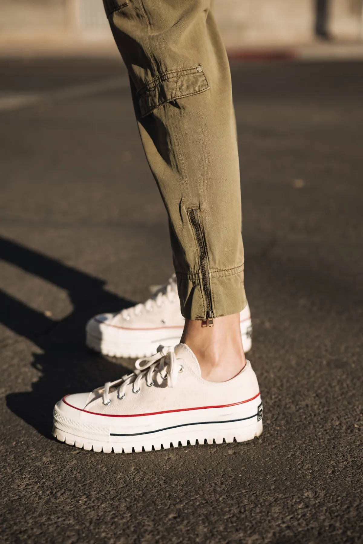 – Pockets on thighs Pocket flap on calf Elasticated hem with zip