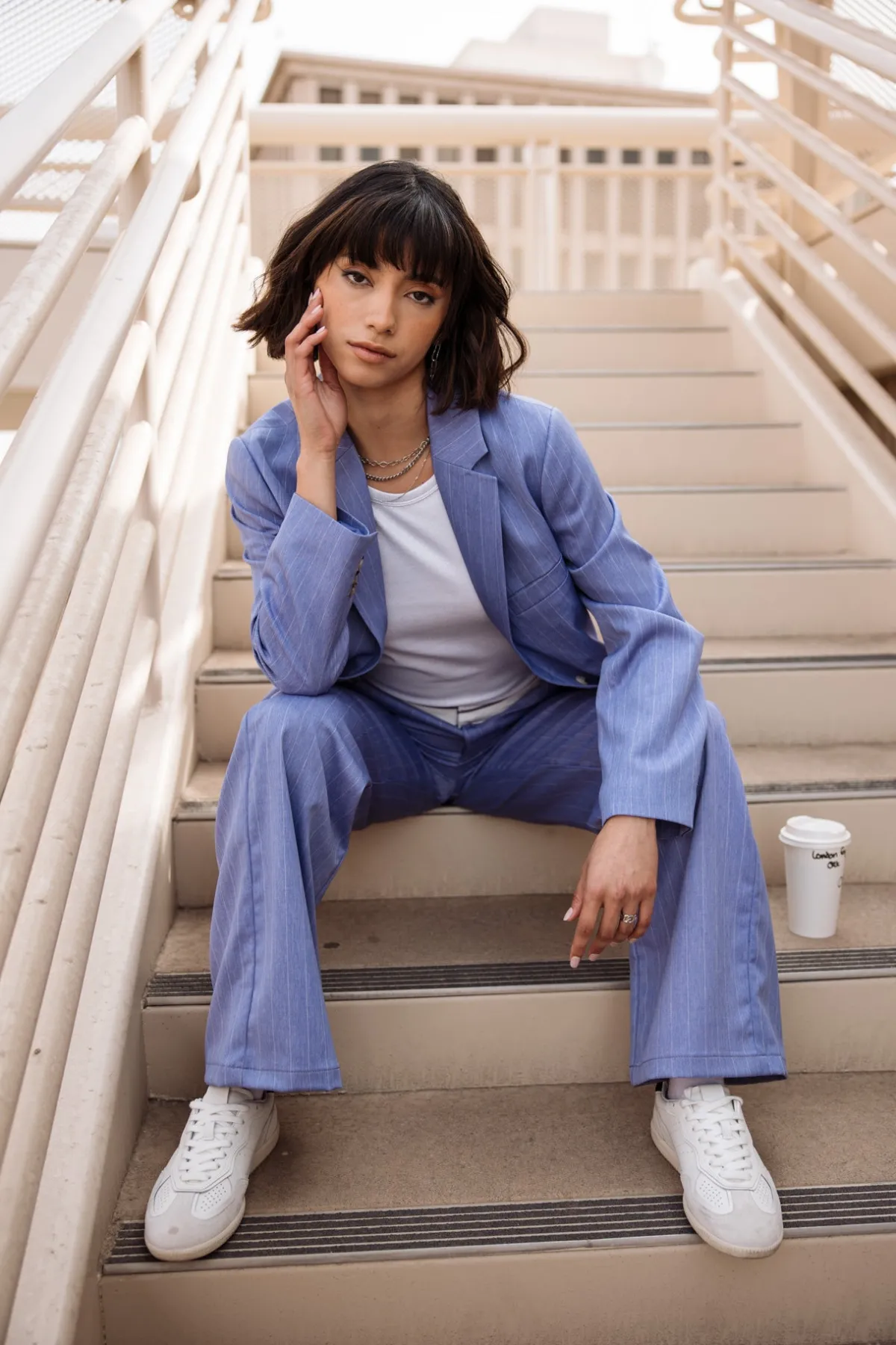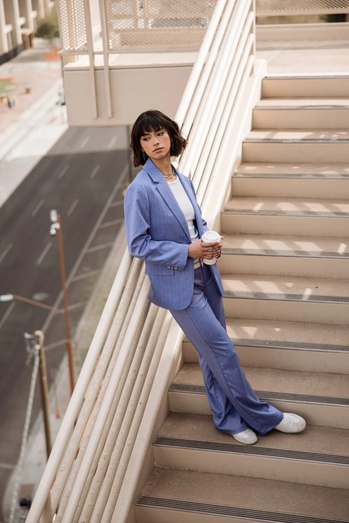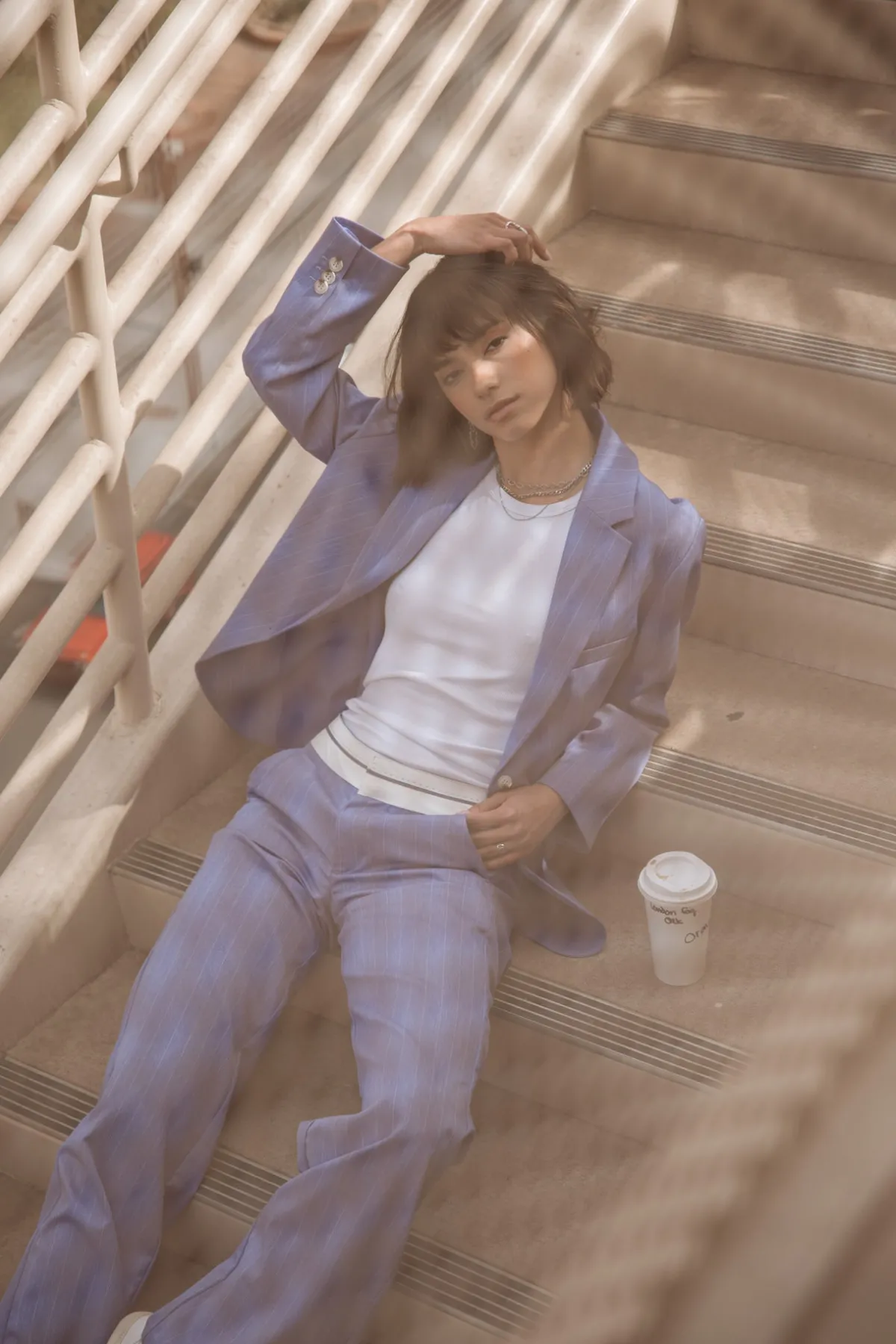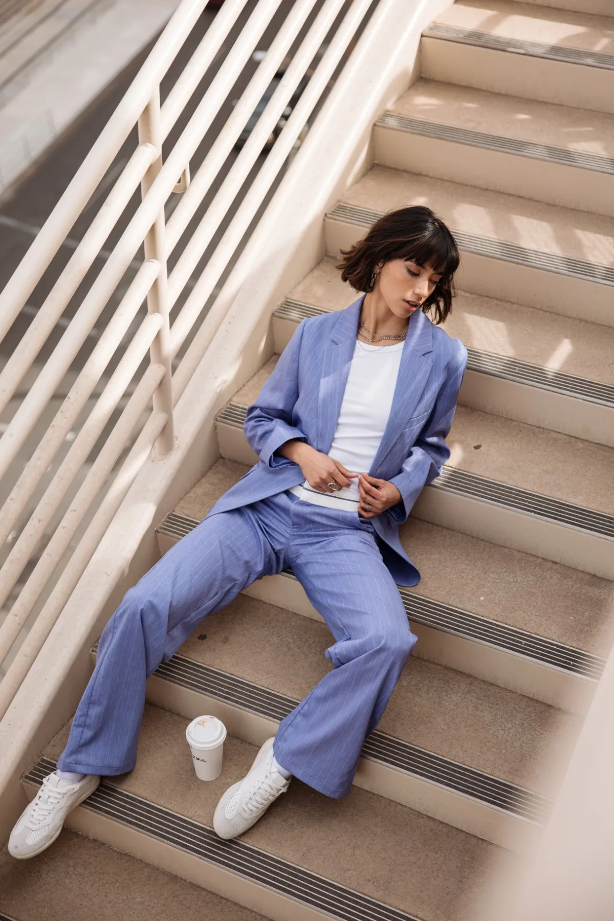 – Stretch city fabric with fine ecru stripes