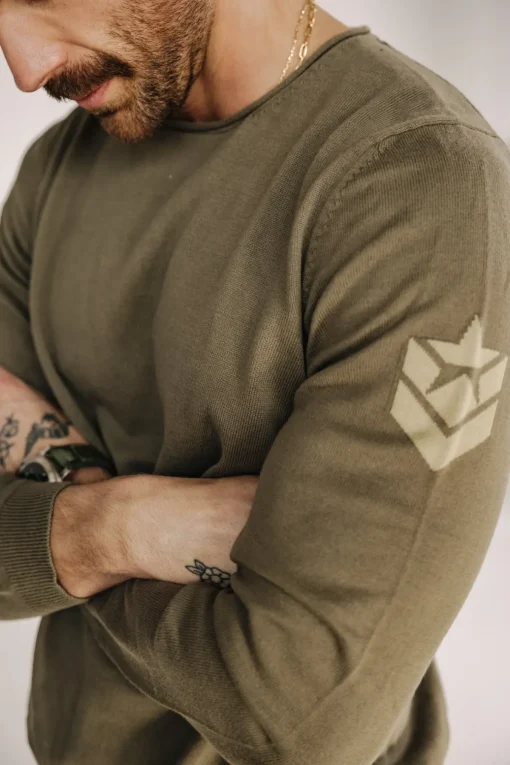 – Contrast intersia chevron logo on sleeve