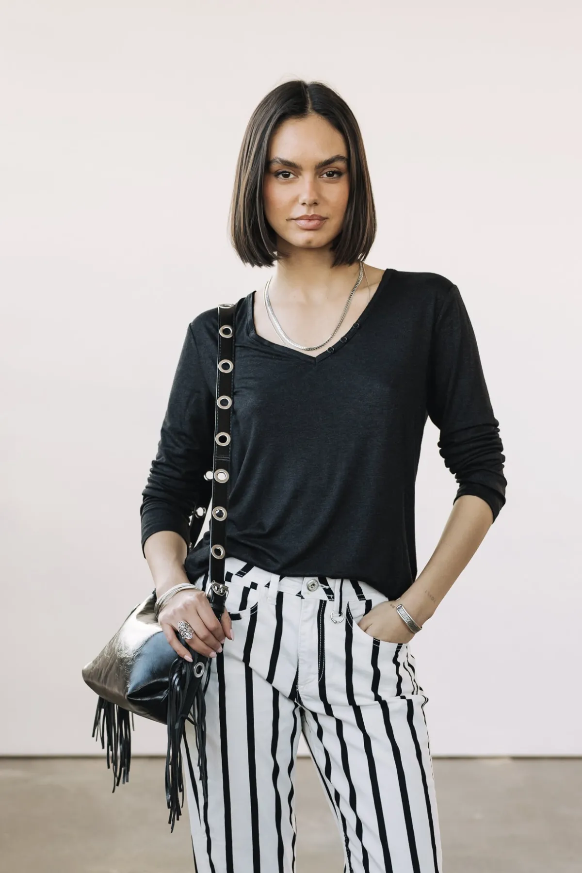 – Deep V-neckline with small engraved buttons
