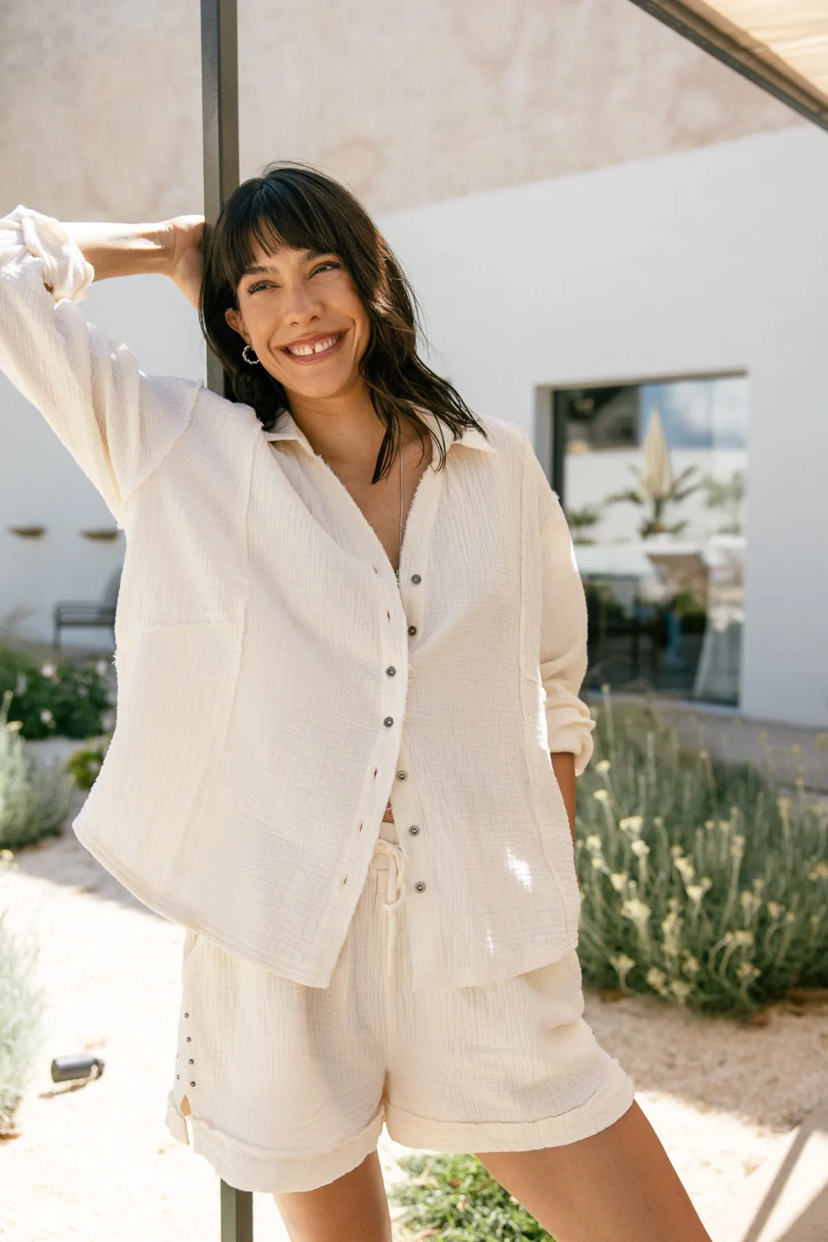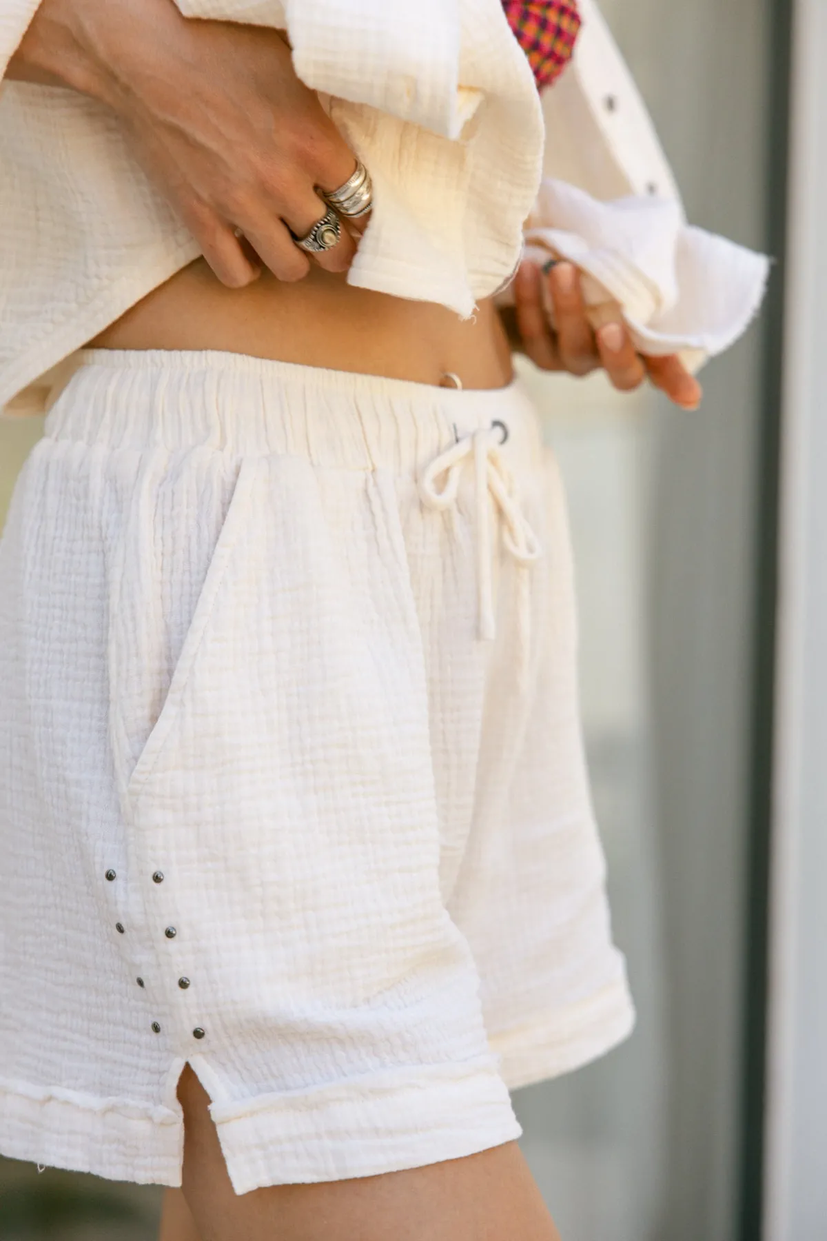 – Short shorts in slightly faded cotton gauze