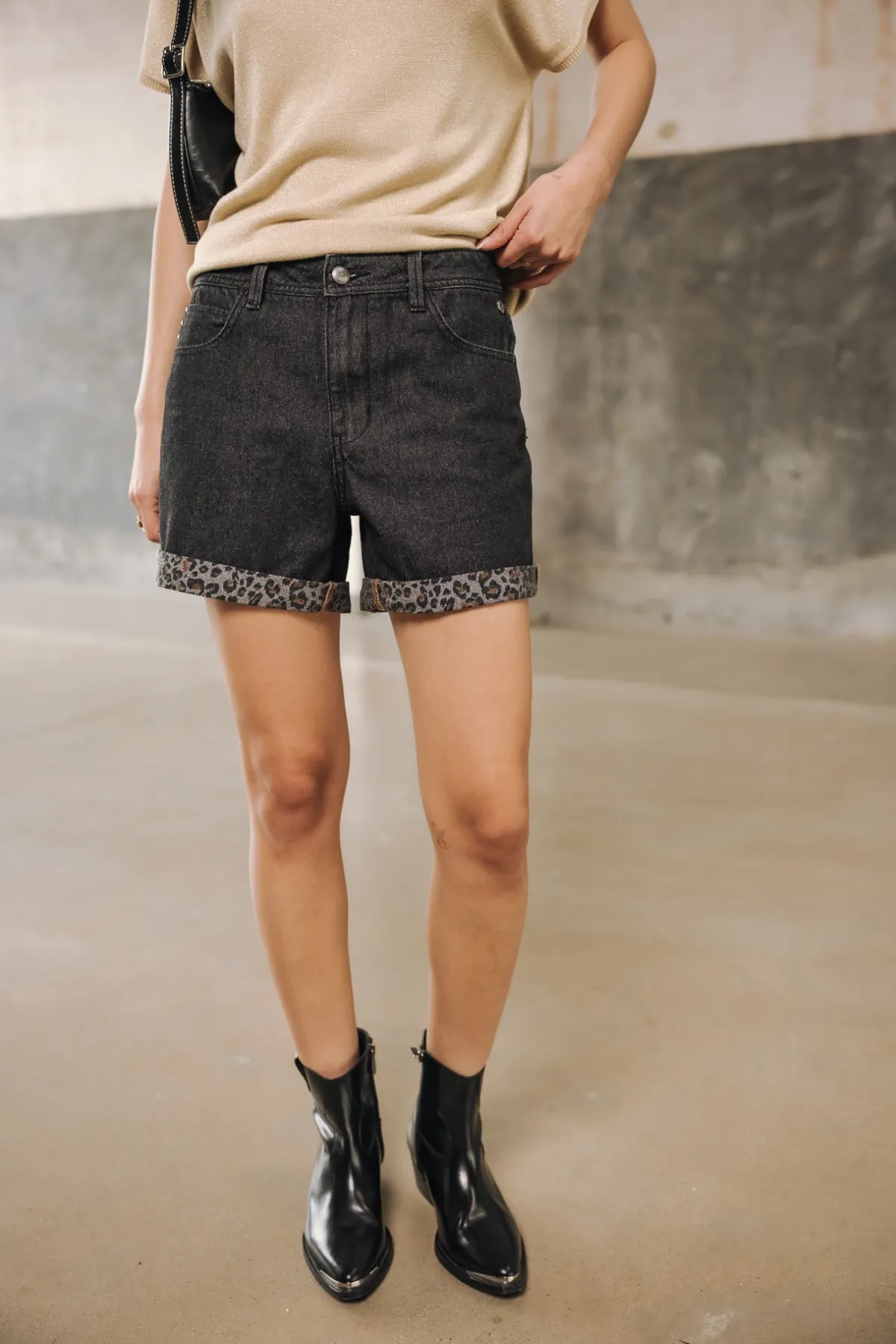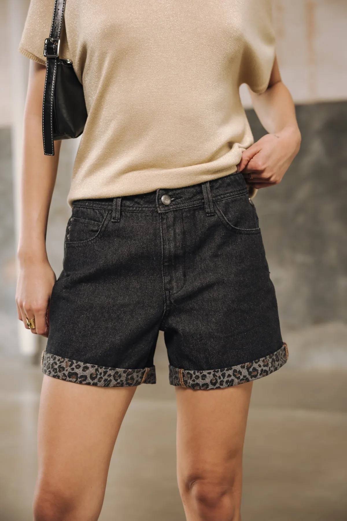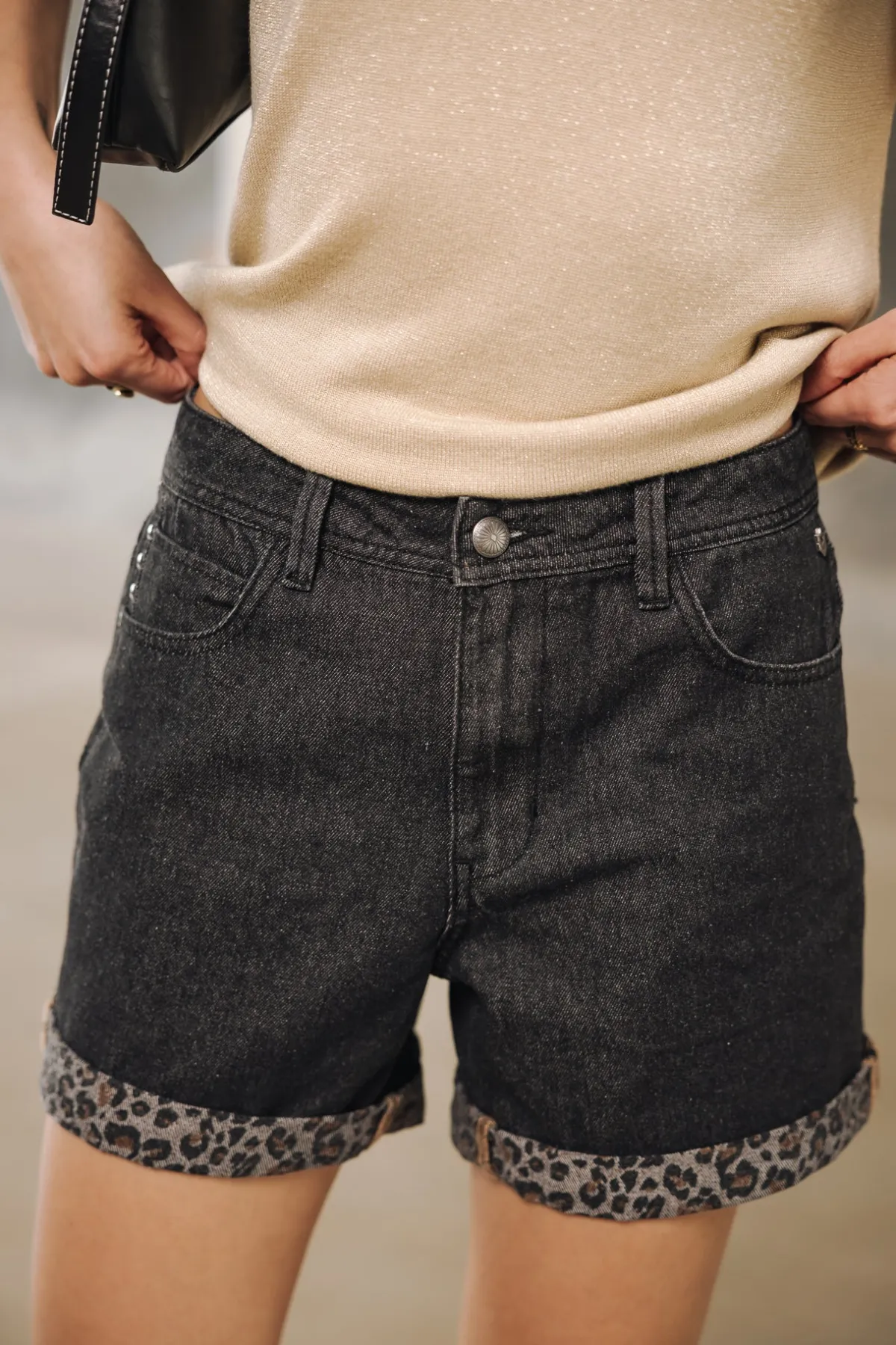 – Worn black wash, leopard print on reverse side