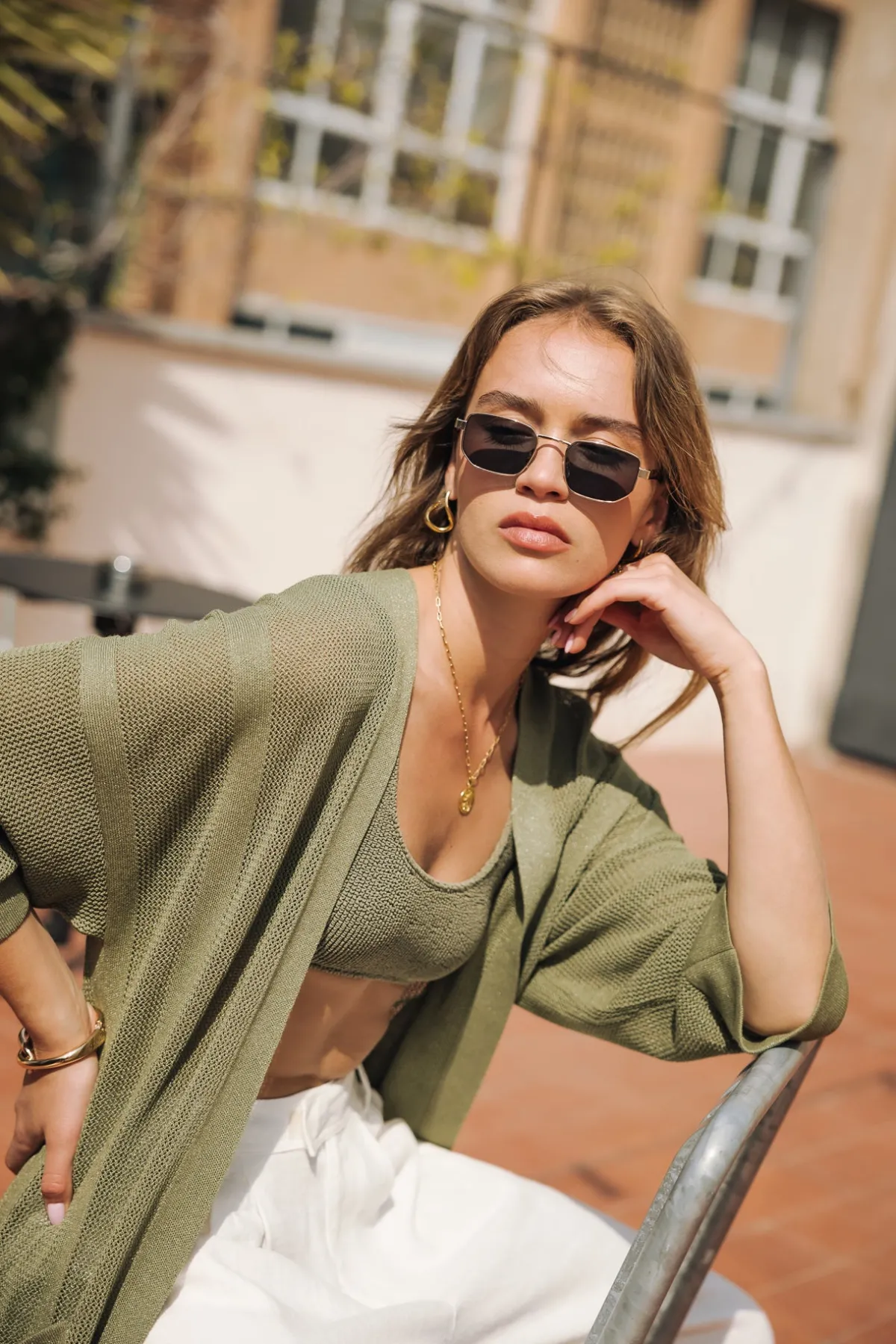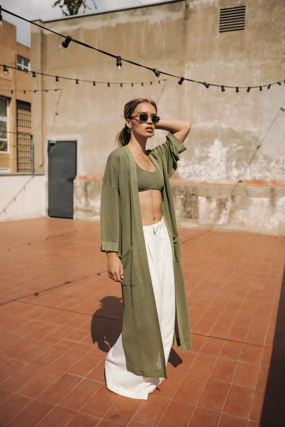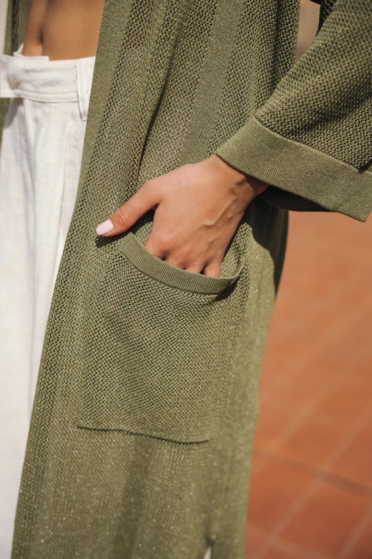 – Long, plain cardigan with kimono sleeves in a fine, iridescent, openwork knit